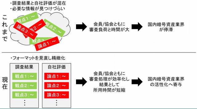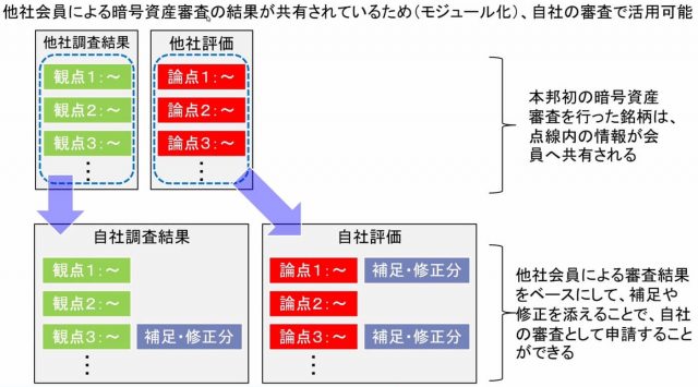 JVCEAはこれらの問題を解決するべく、これからの審査において、本邦初の仮想通貨審査を行った銘柄は他社会員による審査の結果を共有することに決定した。モジュール化された調査結果や評価を活用が可能となり、新規会員は他社会員と異なる観点や論点のみを補足・修正することで自社調査・評価を進めることができる。