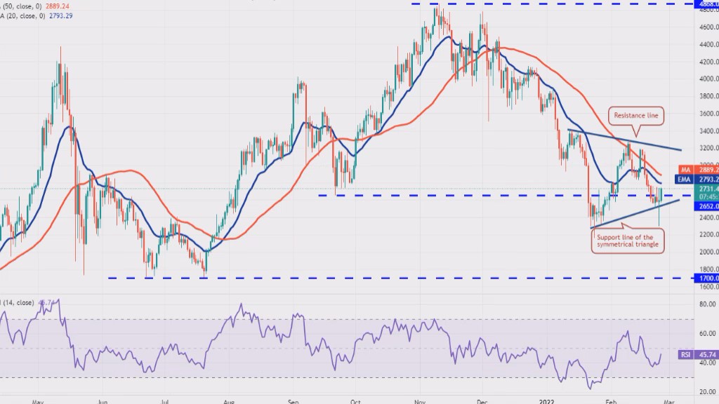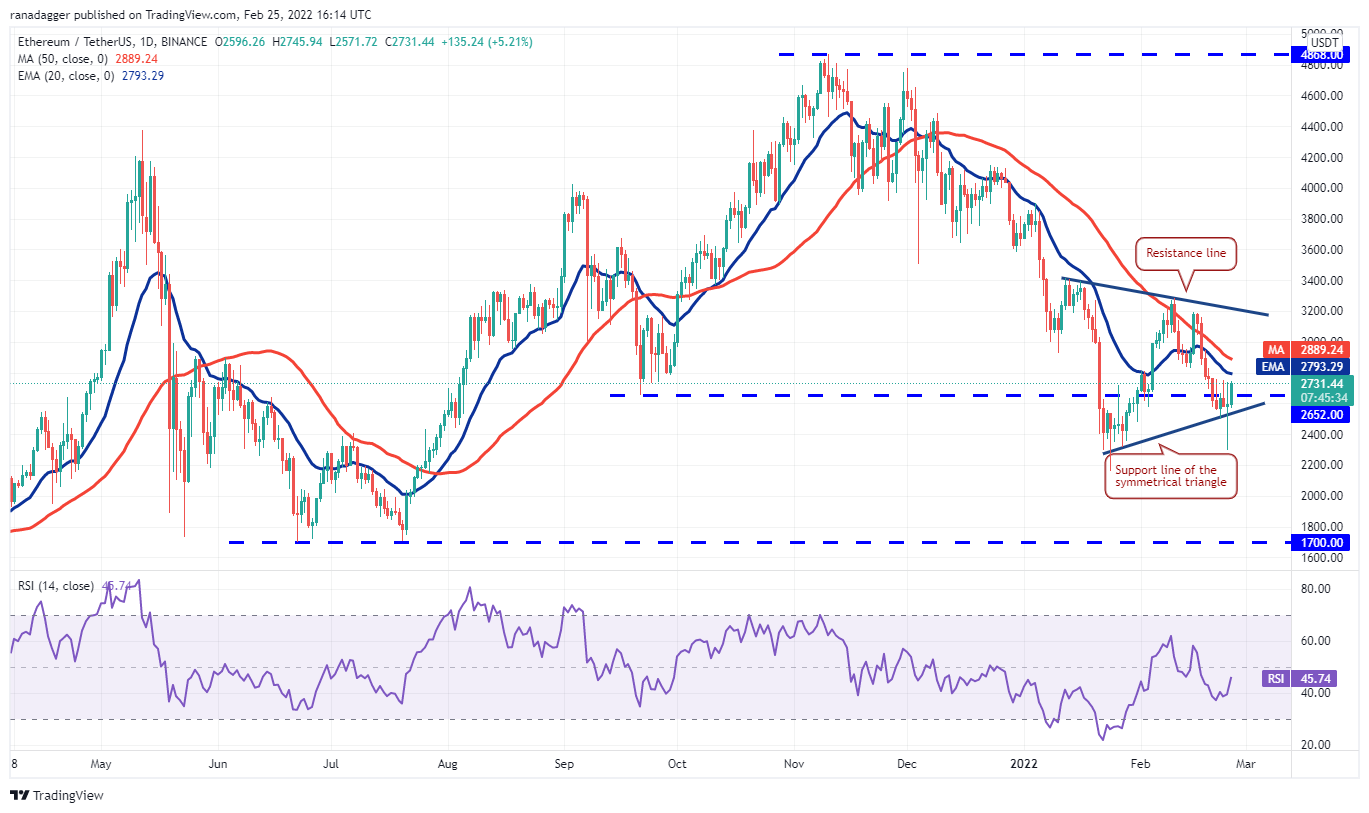 日本語に完全対応している手数料が安いバイビット ※ FXはレバレッジ3X~5XETH / USDT イーサリアム(ETH)は2月24日に対称トライアングルのサポートラインを下回ったが、弱気派はその安値を維持することはできなかった。ローソク足の長い下ヒゲは、安値での強い買いがあることを示している。 XRP / USDT リップル(XRP)は2月24日に0.62ドルのサポートから反発したが、強気派は50日間SMA(0.72ドル)の直上のレジスタンス以上に価格を押し上げることができなかった。その結果、長い同事線のローソク足パターンが形成されました。