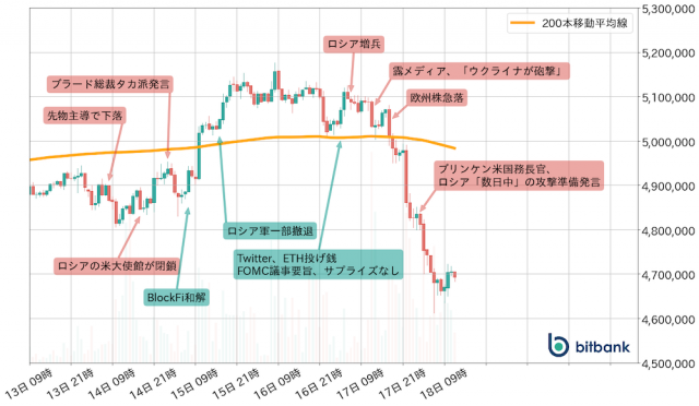 同日欧州時間には、欧州株の下落に連れ安となり、BTCは1時間足の200本移動平均線を節目の500万円を割り込み、米時間には一段と下げ足を速め、480万円まで下落。さらに、この日はブリンケン米国務長官がロシアは「数日中」にウクライナを攻撃する準備をしていると発言し、米市場後場の株安に連動してBTCは460万円付近まで下値を広げた。