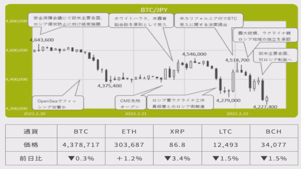 昨日のBTC相場は続落。ミュンヘン安全保障会議における欧米主要各国のロシアに対する警戒姿勢強調や大手NFTマーケットプレイスOpenSeaでのフィッシング詐欺を受けたETHの下落もあり、BTCは朝方にかけて38,000ドル(約435万円)を割り込んだ。