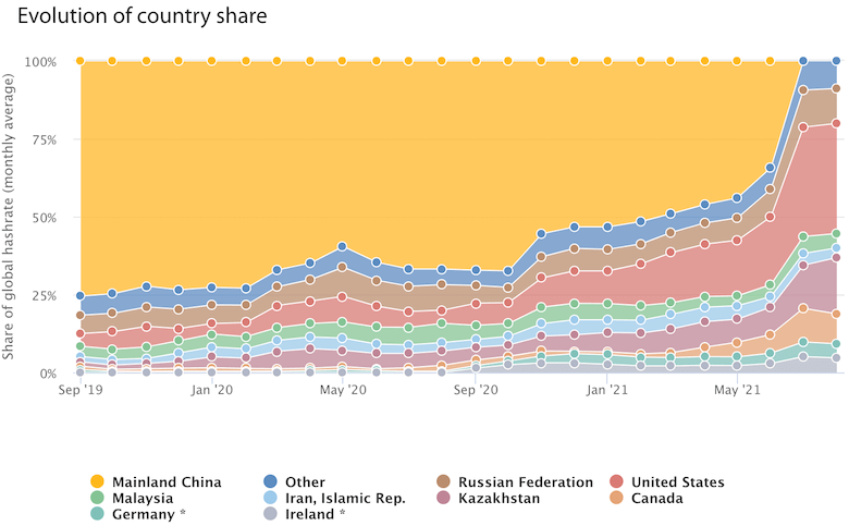 英ケンブリッジ大学の統計によれば、21年8月時点ではカザフスタンのハッシュレートは世界2位まで急成長。米国に次ぐマイニング拠点となりつつある。