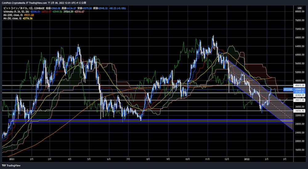 8日時点の50SMAは42,777ドル。200SMAは49,251ドル。