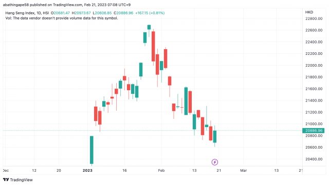 欧米の利上げ政策と正反対の中国の金融緩和継続の中、20日にリスク選好の姿勢が中国・香港株式市場を押し上げ、昨年11月以来の大幅高となった。上海と深センの株式市場に上場する有力企業300銘柄で構成するCSI300指数や上海総合指数、香港ハンセン指数も大幅に反発し、特に不動産株や金融株の上昇が目立った。なお、民間の統計で中国16都市の新築住宅販売は3週連続で増加した。