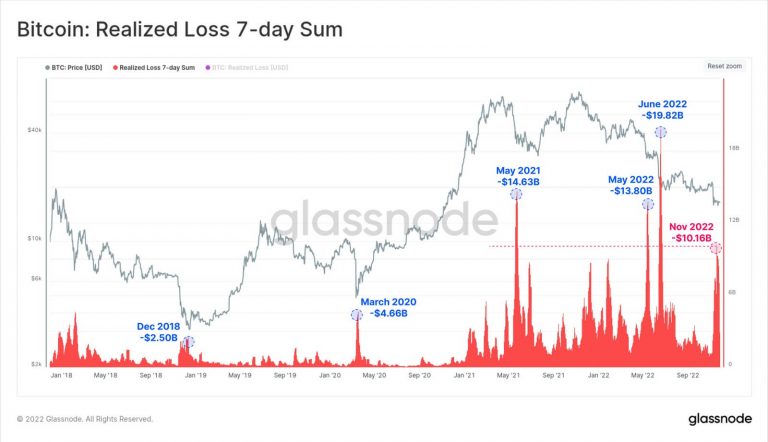 なお、過去1週間のビットコインの実現損失は、史上4番目の規模となる108億ドルを記録した。資金繰り悪化に伴う手元資金の確保や年末の税金計算に向けて含み損を売却・決済したエンティティの多さを示唆する。