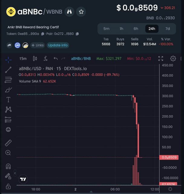 プロトコル侵害のターゲットとされたのは、BNBチェーンなどでリキッド(流動的)ステーキングを提供するAnkrプロトコル(ANKR)のaBNBc。ブロックチェーンデータ閲覧サイト「BscScan」、及び分析機関Nansenによると千兆単位(6,000兆ドル)のaBNBcが発行されている。